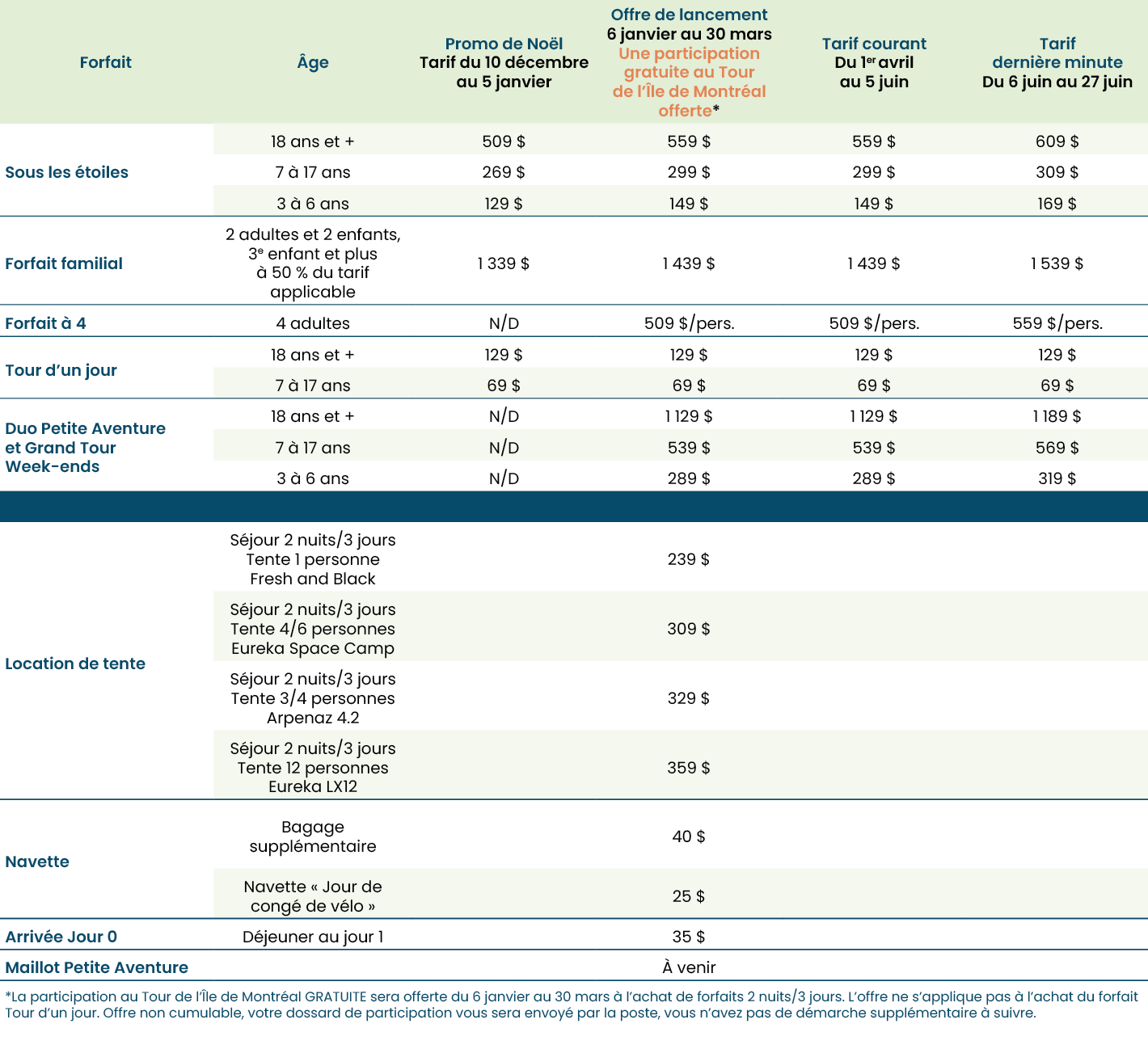 Nuitées en camping selon le forfait choisi. Pas de nuitées pour le Tour d’un jour.