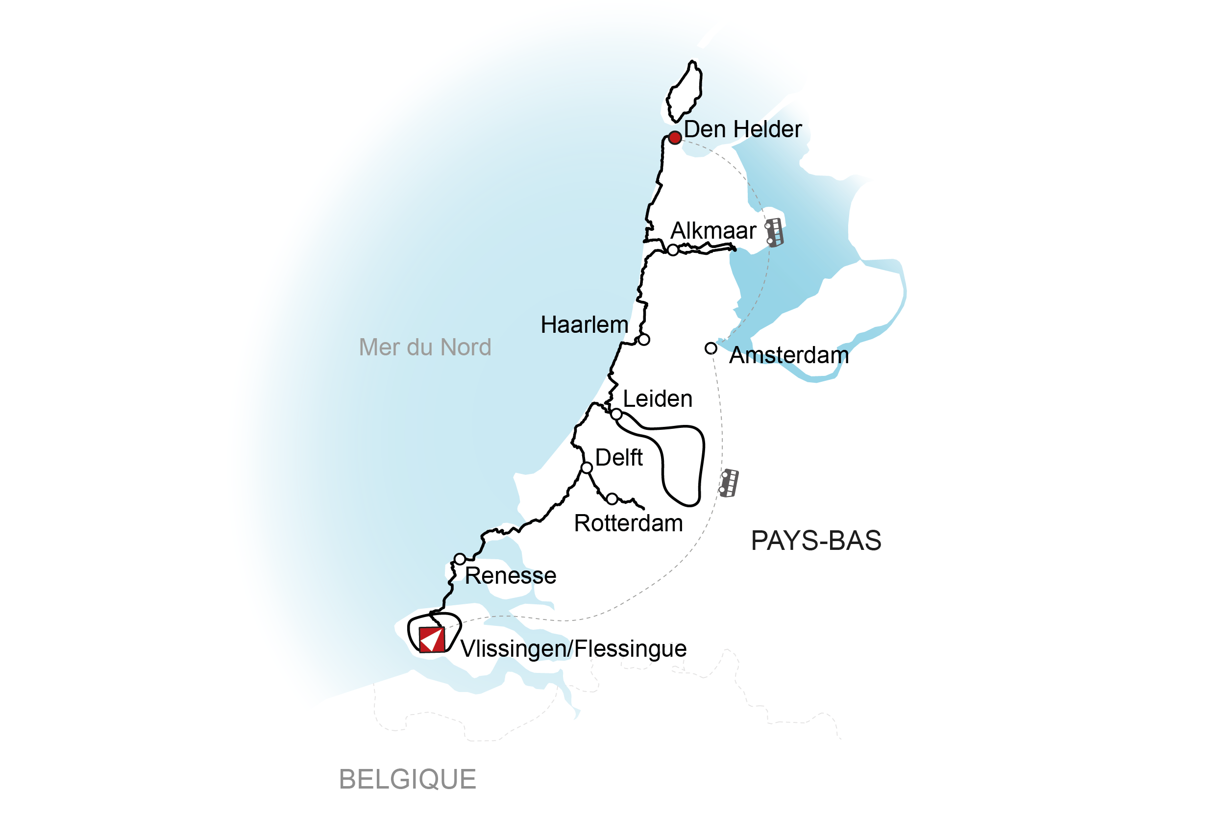 L’absence de difficultés à traverser vous laissera en pleine forme pour profiter des superbes villes et lieux que vous croiserez, notamment la magnifique île de Texel et ses paysages qui rappellent les Maritimes, les jolis canaux urbains de Delft ou Haarlem, ou encore l’impressionnante architecture colorée de Bruges, où vous ferez un petit crochet belge en fin de voyage.