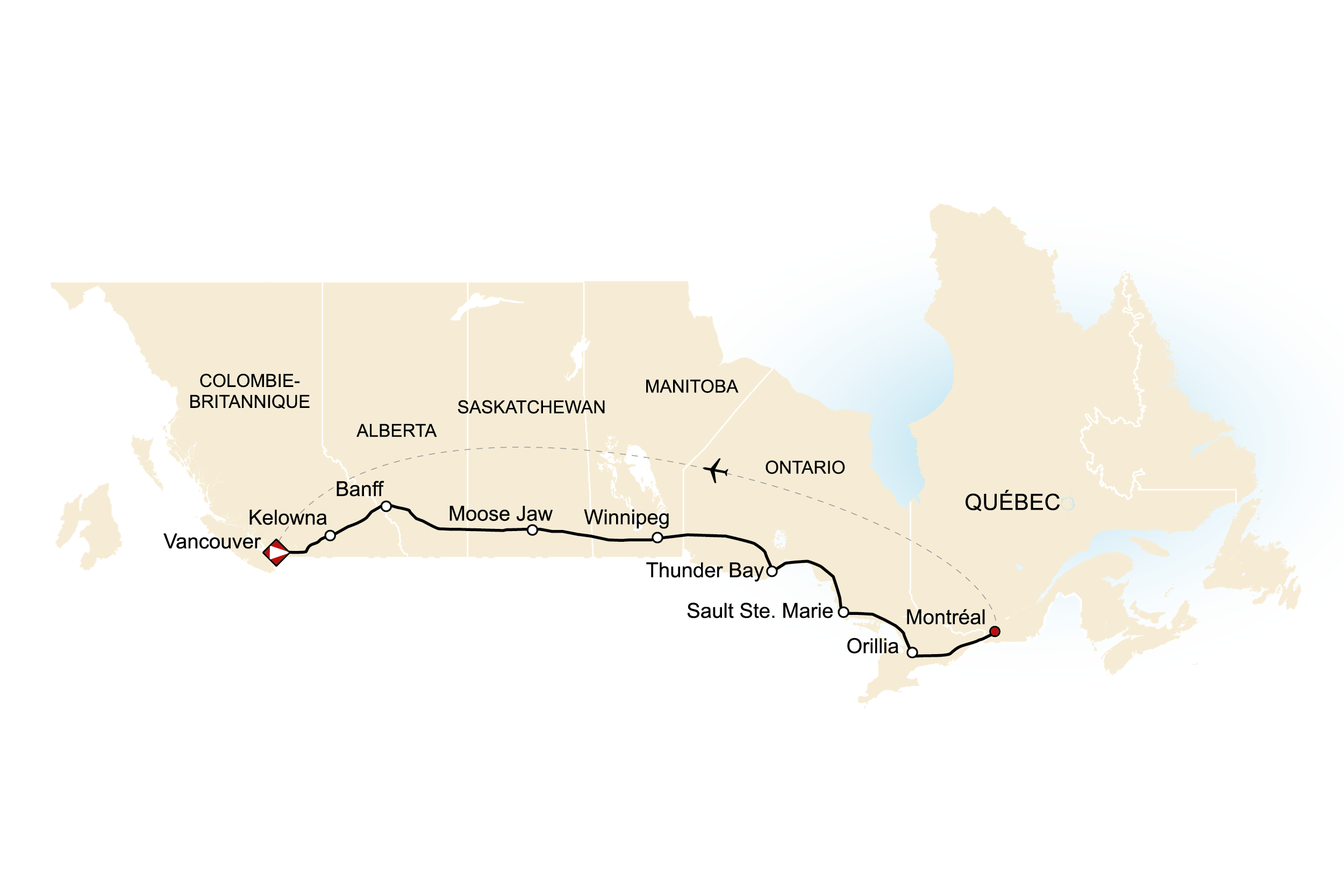 Du Pacifique au fleuve Saint-Laurent, franchir le Canada à vélo est plus qu’un voyage : c’est une odyssée. Une traversée grandiose d’un océan à l’autre, à la rencontre d’un territoire immense et d’une nature qui change de visage jour après jour. Des montagnes majestueuses de la Colombie-Britannique aux lacs infinis de l’Ontario, en passant par les côtes sauvages du lac Supérieur et les grandes plaines dorées des Prairies, cet itinéraire met en lumière l’âme même du pays.