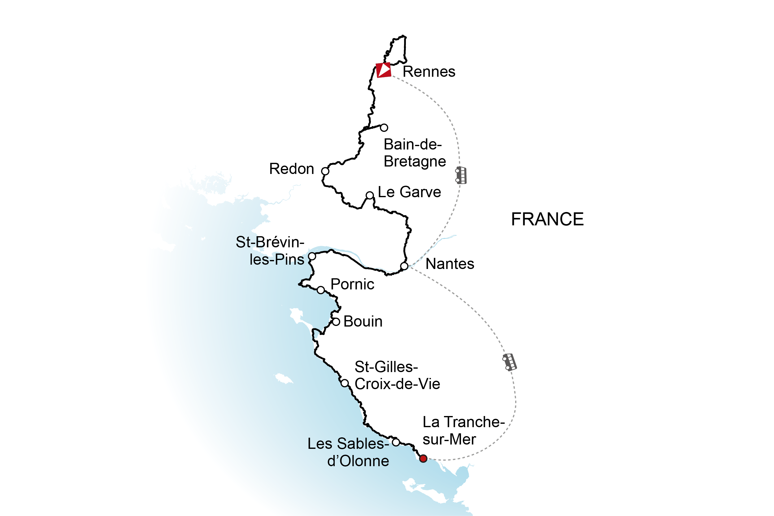 Les Sables-d’Olonne, Talmont-St-Hilaire, Jard-sur-Mer, Longeville-sur-Mer, La Tranche-sur-Mer. (47 km). Transfert à Nantes.