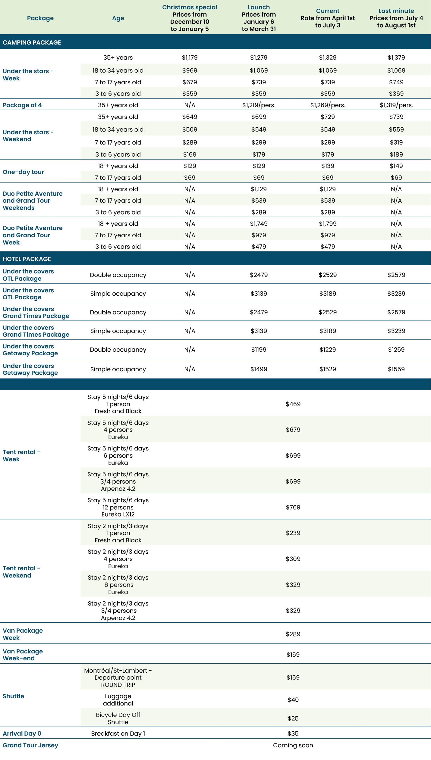 You can register online until July 30, inclusive. It will also be possible to register on site. On-site registration will take place at the INFO kiosk at the departure site for the 3- and 6-day Under the Stars packages. Debit/credit cards only.