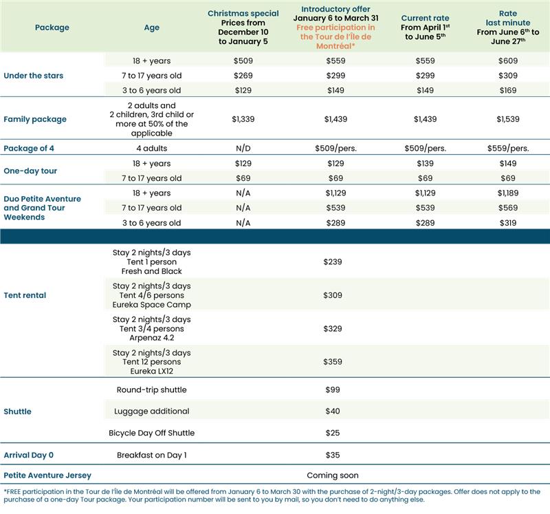 A gluten-free menu is available at mealtimes. However, due to the large volume involved in the logistics of meal service during the Petite Aventure, we cannot guarantee 100% that there will be no cross-contamination of food.